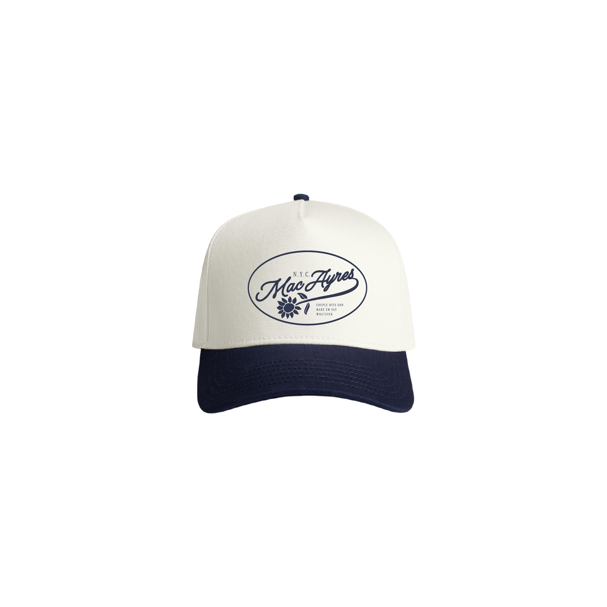 High profile, mid-weight 100% cotton hat with a structured front, contrast dome, plastic snapback, curved peak, and tonal eyelets.