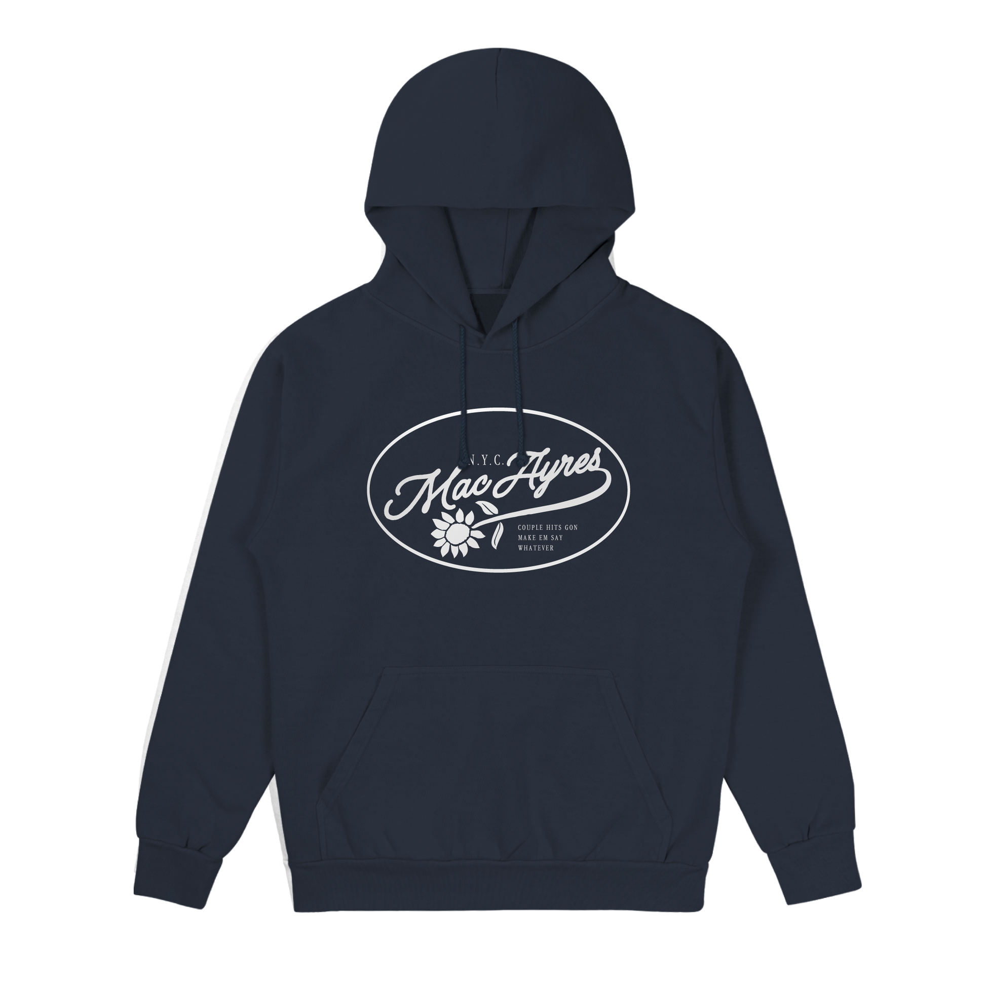 Screen printed on a navy 80/20 ring-spun cotton/polyester blend fleece with 100% cotton face hoodie.